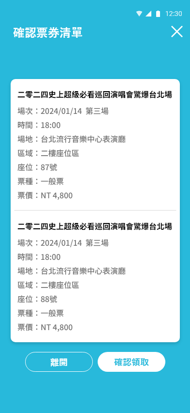 確認票券明細 : 演出展覽名稱、日期 、地點….,是否符合
