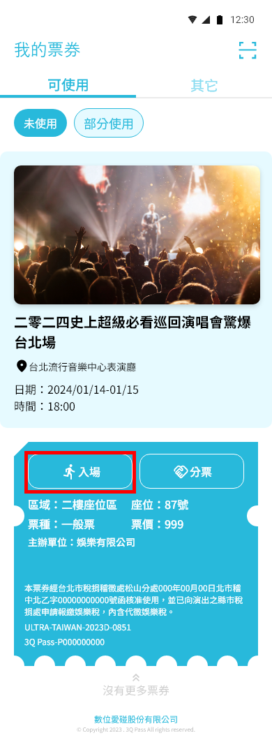 【我的票券】 >票券詳細頁 > 點選入場按鈕