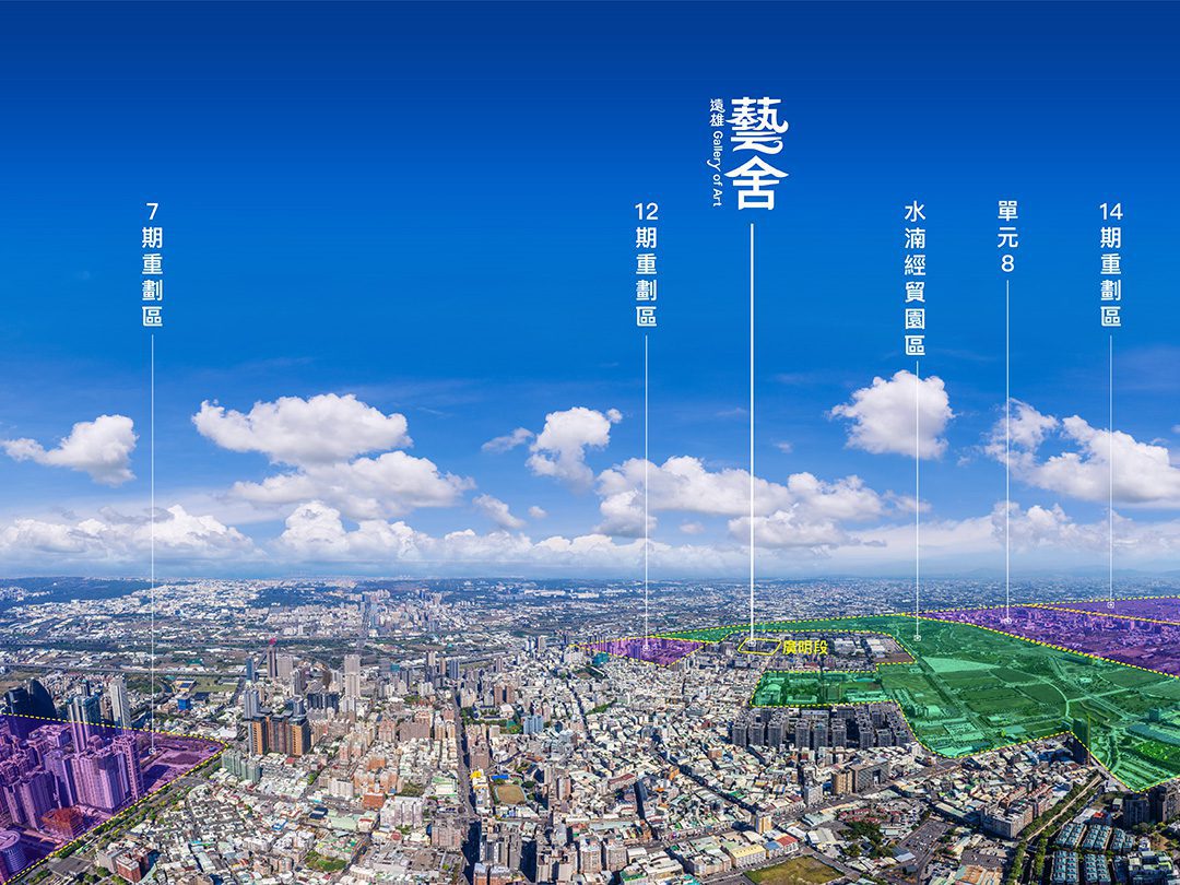 遠雄藝舍位於水湳經貿園區之廣明段,位於水湳西側、緊鄰12期、逢甲生活圈,立地水湳及12期正中心地段。