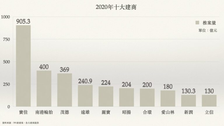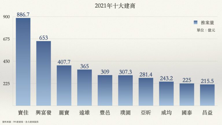 受疫情影響,去年全台推案量為1.7兆元,僅僅前十大建設便聯手貢獻逾4千億元案量,十大建商去年案量合計約較2020年量減1成多,自2019起三連霸的寶佳機構推案雖有減少,但憑藉旗下子公司推案齊發,在各大重劃區都能見其蹤跡,仍穩坐龍頭。亞軍興富發,則是開始創造南北連線,隨著房市續旺及自身豐沛的土地庫存,興富發今年推案力道也持續看旺。麗寶集團近年購地版圖走「包山包海」路線,大手筆標下金山市區的多筆土地,甚至到雲林虎尾、南投仁愛鄉都可見其腳步,此舉讓它衝上了第3名。