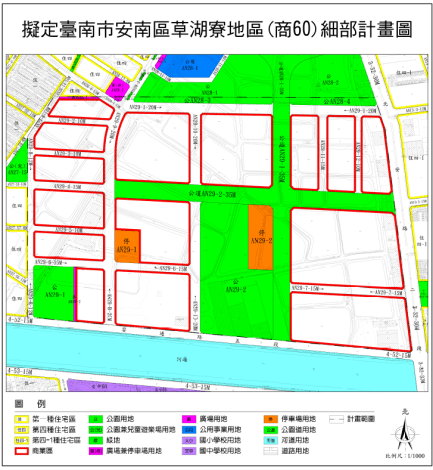 「商60」商業區位於安南區草湖寮地區,面積37.17公頃,位於安南區北安路、安通路五段交叉口處,於民國92年即劃設為商業區,規定以市地重劃方式開發。全區規劃商業區22公頃,公園綠地5.01公頃,其中包含「公AN29-1草湖寮地景公園」與「公AN29-2台江地景公園」,另劃設兩處共1公頃之停車場用地,除引進更多服務產業,強化該商業區發展機能外,都市計畫亦規定退縮建築、最小開發規模及都市設計審議機制,進一步塑造新興發展地區之環境質感與景觀意象,預計2024年完工。