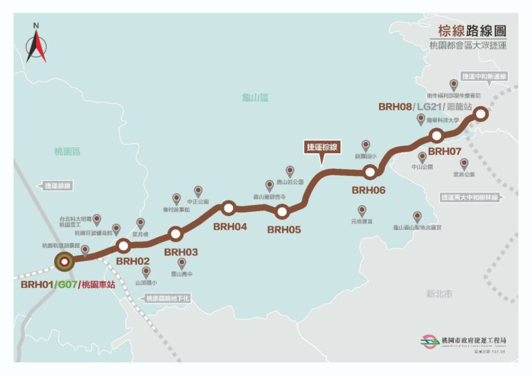 捷運棕線(規劃中):迴龍線由桃園市桃園區復興路與中正路口的BRH01站(桃園車站)起延伸。