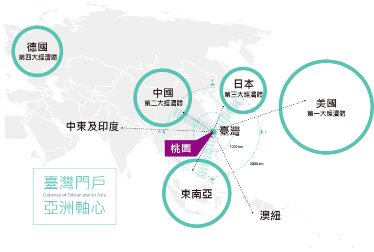 ▲桃園航空城的發展定位,預計打造桃園成為臺灣輪軸,發揮「前店後廠」效應 資料來源:桃園航空城