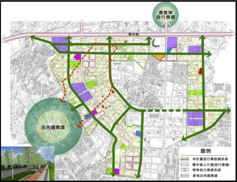 14期重劃區早期由農路、水圳及聚落通路所形成之特殊鄉間鐵馬道文化,台中市政府規劃沿綠園道系統,總長約27.2公里自行車道,銜接洲際棒球場、中興網球場等各項公共設施,除提供區內休閒、通勤機能使用,亦能與現有潭雅神、后庄社區庄內鐵馬道銜接,以提供市民多樣化的休憩空間,更符合本重劃區以節能減碳為目標的綠建築內涵。