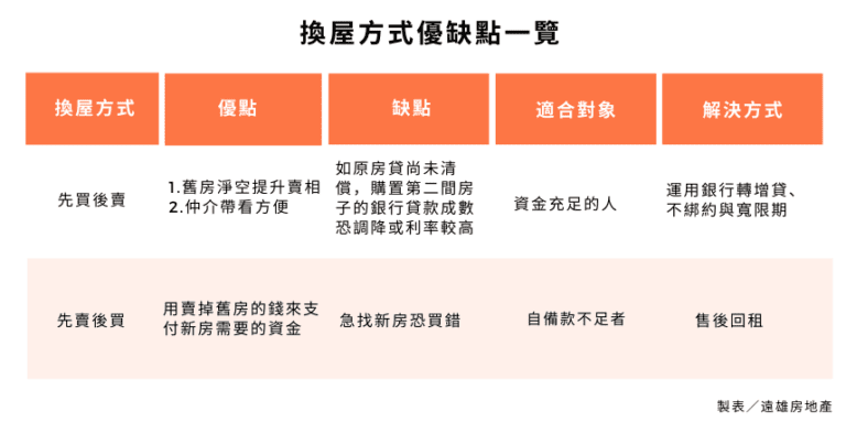 換屋是一件重要的事,資金充足的人適合「先買後賣」,如此一來舊房淨空賣相較佳,有機會賣到更好的價格;自備款不足者適合「先賣後買」,可以用賣掉舊房的錢來支付新房需要的資金。了解兩者間的優缺點後,找出適合自己的買賣方式,幫自己和家人尋覓下一個更適合的空間,也幫原來的家找一個新的主人!