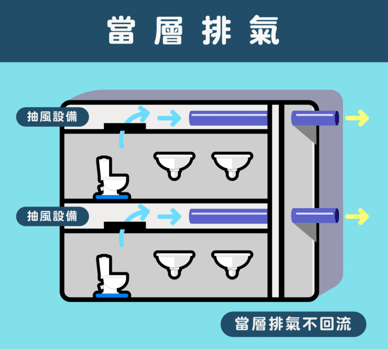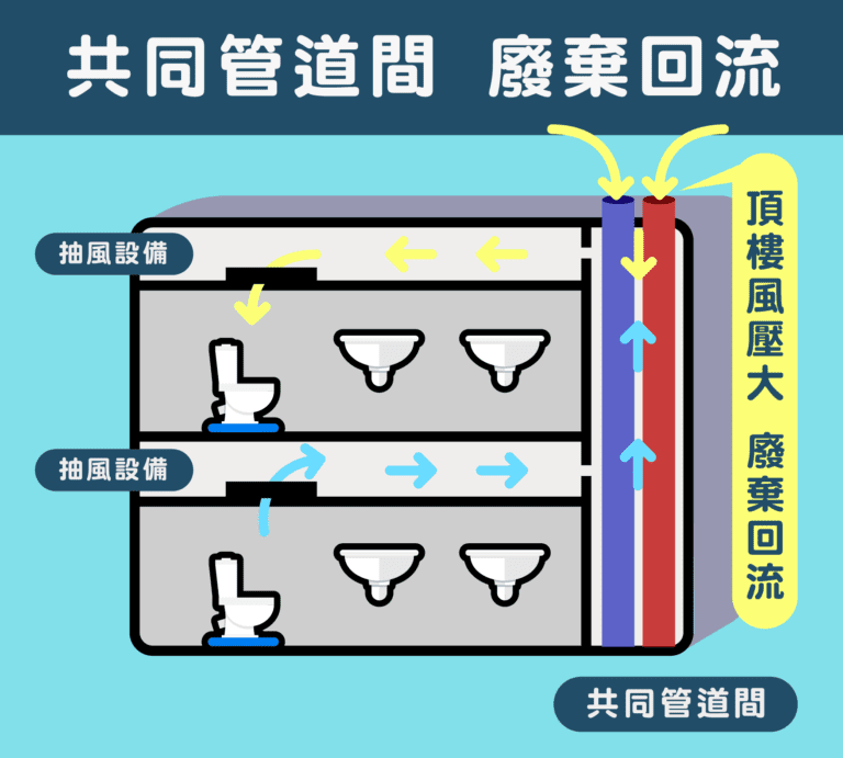 許多老舊的建築多採取共同管道間,管道間內包括排水管、進水管、糞管、排氣管等,整個管道間由下到上,出口通常會在頂樓的位置,將廢棄排出,而入口則通常會在廁所天花板,以管線接到牆壁的地方,外面通常就是管道間,共同管道間的設計,容易造成廢氣回流的情形,主要是連接管子的牆壁未完全密封,或頂風壓大的時候,容易導致廢氣(菸味、異味、病毒)逆流,再經由管道間縫隙,抽風排氣管回灌到室內。