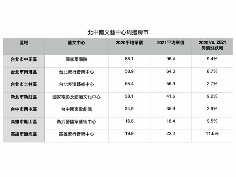 住在「藝文中心」週邊是什麼樣的生活體驗?台灣地狹人稠,藝文展演類型場館卻不缺乏,除了讓大家可以被滿滿的藝文氛圍包圍,也為市容地貌增添一些文化氣息,全台北、中、南的七大相當具代表性的藝文展演場館,皆有廣大的佔地,根據內政部實價登錄,觀察近兩年周邊1公里內的房價變化,房價均有上升趨勢。