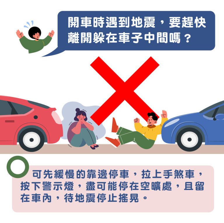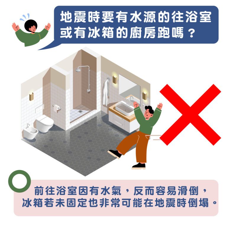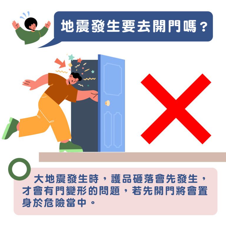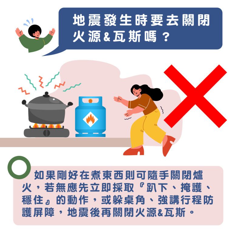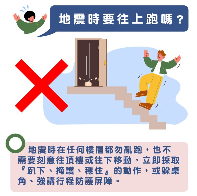 除了記住地震保平安口訣外,地震發生時切記不要慌張,以下五大迷思值得留意,下方以圖解說明: