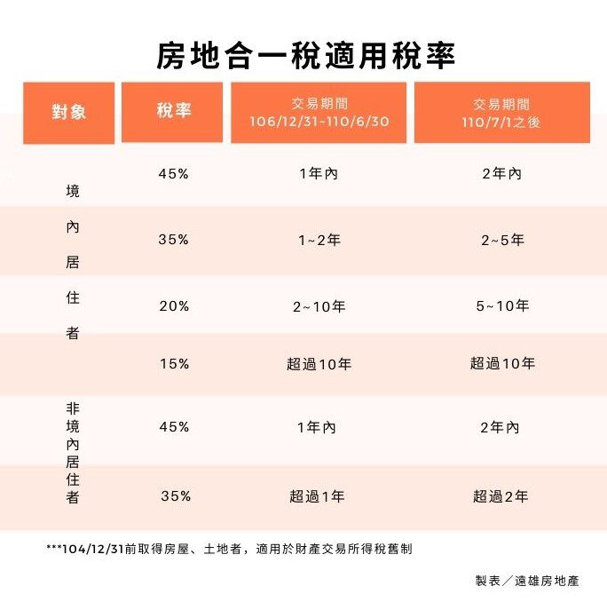 過去的稅制,土地與建物分開繳納,賣出房屋時,土地不需要繳所得稅。但為了避免投資客短期出售獲利的炒房行為,政府自105年實施房地合一稅1.0,規定房屋持有期間在1年以內及超過1年未逾2年者,課以45%及35%較重稅率;110年7月起,更推出房地合一稅2.0,延長個人短期交易房地適用高稅率,個人交易持有2年以內房屋與土地,稅率45%;持有房屋與土地超過2年未逾5年,稅率35%,期能透過重稅打房、抑制短期炒作。