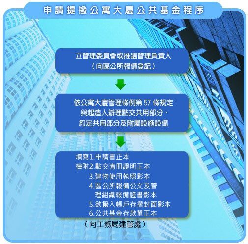 公共基金是一筆屬於全體區分所有權人的錢,主要來自區分所有權人定期繳交,用於公寓大廈管理組織行政與總務事務、建築物修繕、設備設施維護、修理等。申請提撥公寓大廈公共基金程序其實很簡單,只要申請人填寫申請書,並檢附點交清冊證明正本、建築物使用執照影本、區公所報備公文及管理組織報備證書影本、欲撥入帳戶存摺封面影本及公共基金存款單即可辦理。