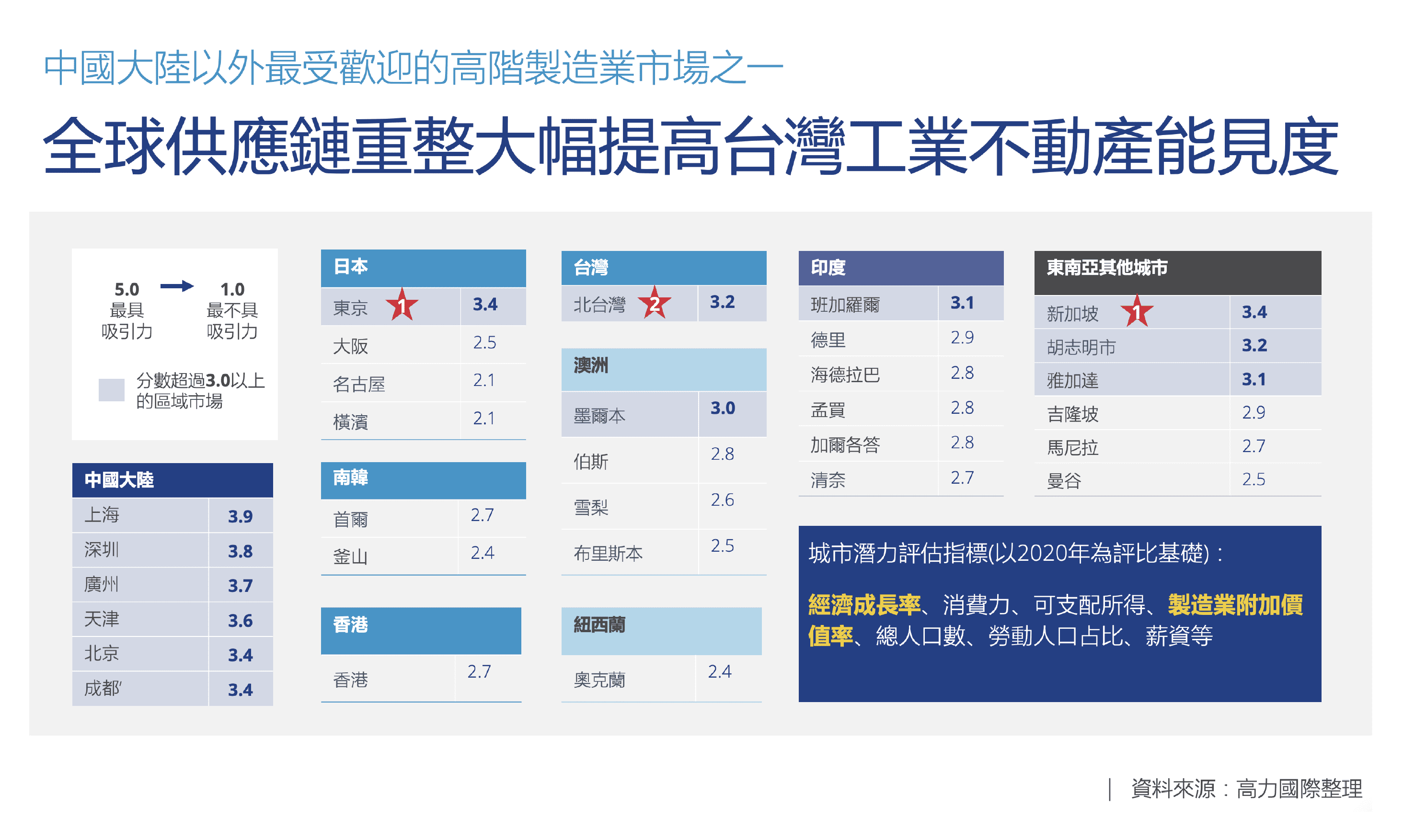 經過美中關係矛盾及新冠疫情影響後的全球供應鏈重整,大幅提高台灣工業不動產在亞太區域的能見度,依高力國際亞太區在2021年中所做的一項評比顯示(圖一),評比的潛力指標包含經濟成長率、消費力、可支配所得、製造業附加價值率、總人口數、勞動人口占比、薪資等,台灣(係指北台灣為主)位居第二名,僅次於新加坡及日本東京,成為中國大陸以外最受歡迎的高階製造業中心。