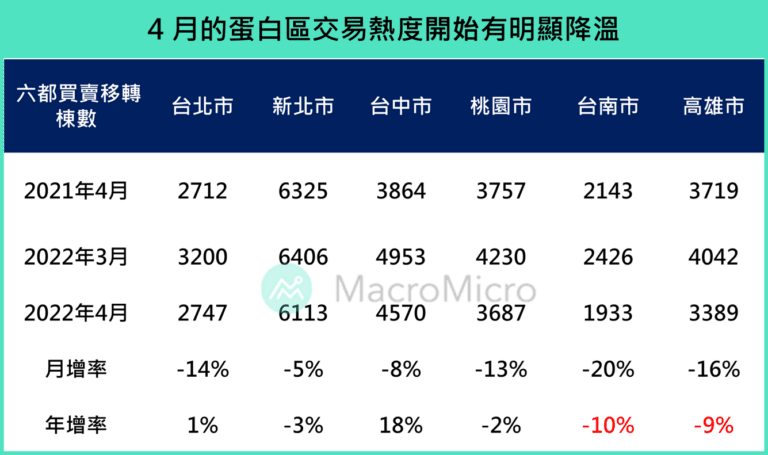 在 3 月央行宣布升息 1 碼,加上政府重打預售炒房下,投機狀況有明顯回落,4 月六都的買賣移轉棟數已有多地的交易量呈現降溫,台南和高雄的移轉棟數顯著回落,分別年減 -10% 和 -9%。