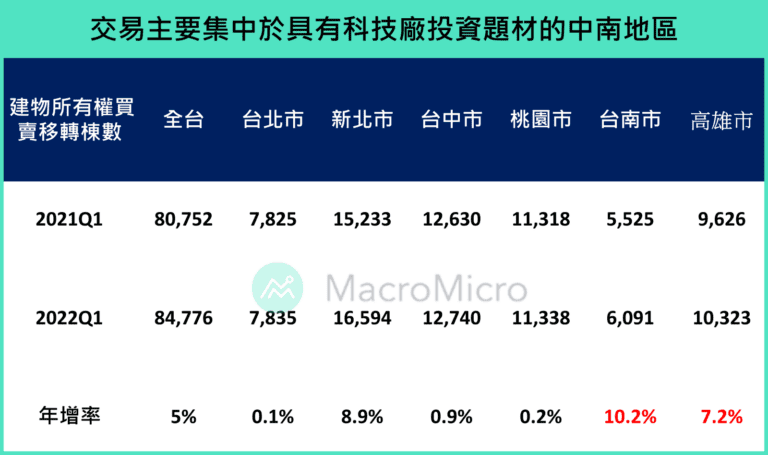 回顧這一兩年的房地產,雖有台商回流及科技廠加大資本支出等題材,但蛋黃區土地已趨於飽和的情況下,廠商必須向外尋地,因此帶起了以台積電為首的中南部擴廠潮,而受惠於南部半導體 S 走廊地區的漲幅最明顯,從上表的信義房屋指數來看,高雄地區為這兩年漲幅最高的地區,而從建物所有權買賣移轉棟數也可發現台南和高雄兩市今年依然是全台成交的熱點區域。以國泰可能成交價來看,由於此指數是以各地的預售屋及新成屋的開價平減議價空間後,以固定權數做編制,可透漏出預售市場也開始有明顯投機的狀況,全台房價在第一季漲幅已高達 27.2%,創該數據創建以來最高,主要漲幅也是落在具有題材性的新竹、台南及高雄地區,年漲幅達 48%、26%、33%。