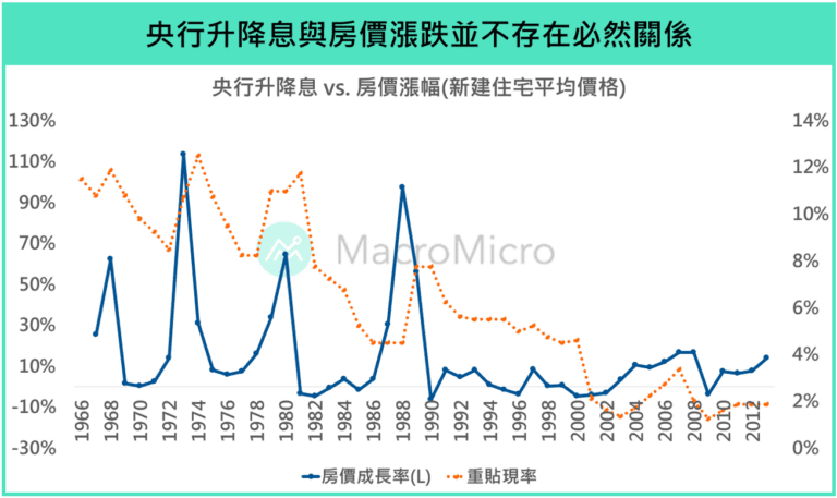 但第二波房地產上漲則是在升息環境中發生, 1973 年中東戰爭所引發的第一次石油危機,期間油價漲了將近 300%,導致原物料及通膨大漲,而台灣央行為了抑制通膨大幅調高重貼現率,但高漲的原物料價格也影響了營建成本的上升,並轉嫁到房價上,加上市場對抗通膨投資需求,反而持續助推了台灣房地產於 70 年代的飆漲,這期間每年平均漲幅則高達 170%,期間共升息了 5 次,而在重貼現率高達 11% 的情況下也沒有止住房地產上漲的跡象,因此可以簡單結論,整體房市的趨勢,仍要回到需求的狀態是否強勁且能夠抵禦資金環境的緊縮,使得建商能夠順利轉嫁成本,帶動房價持續上揚。
