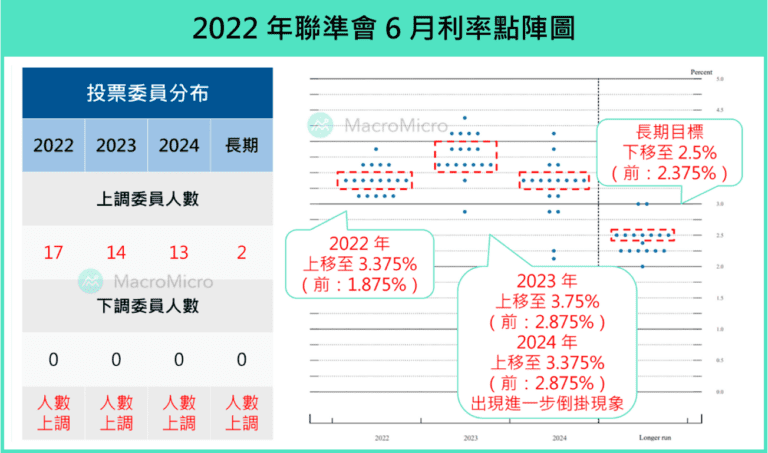 聯準會於今年 3 月份首次升息一碼,其後 5 月份再度升息 2 碼,6 月更是一口氣升息 3 碼,在短短 3 個月內將基準利率自原先 0 – 0.25% 提高至 1.5-1.75%,並於 6/1 開始實施每月 475 億(美債 300 億、MBS 175 億)的縮表,預計在 3 個月後,縮表量將提升至每月 900 億。聯準會在最新聲明稿提及:強力承諾將使通膨回落至 2% 目標,並在最新點陣圖大幅上調 2022 年、2023 年、2024 年以及長期利率中位數,透露聯準會將加速升息打壓通膨的鷹派態度,全年升息次數將達到 13 碼至 3.25 ~ 3.5%,超過先前所預估中性利率的 2.375%。