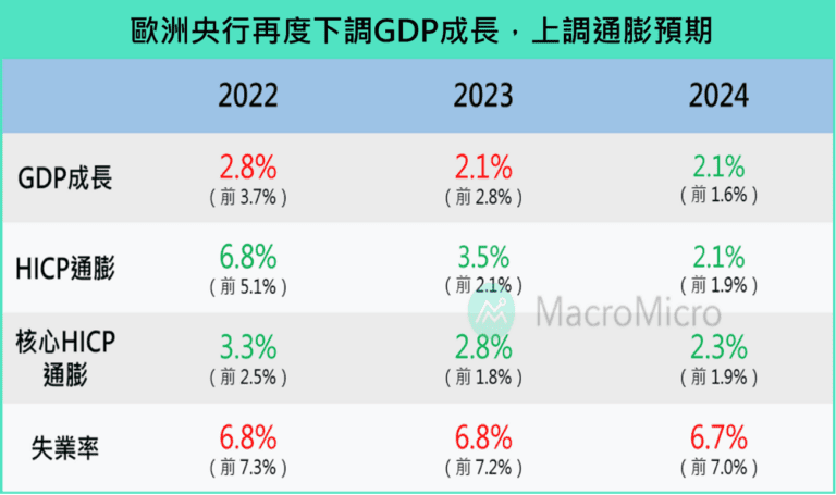 在經濟數據上,雖然從目前的資料來看,歐洲央行仍認為在服務業復甦支撐就業市場下,未來兩年出現衰退的機率較低,然而歐洲央行於本月會議再度下調今明兩年 GDP 成長預期至 2.8%、2.1%,受原油、天然氣價格高漲、俄烏衝突等影響,預計今年 Q2 GDP 年增率由 Q1 的 5.45% 降至 3.17%、季增年率則由 1.21% 降至 0.80%,通膨的部分則受到戰爭影響,不確定性較高,預計消費者物價 HICP 將在 Q2 達到 7.5% 後緩步下降至 Q4 的 6.4%,但到 2024 年通膨仍會達 2.1%,持續超過央行 2% 的目標水準。