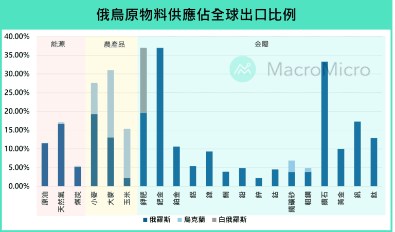 俄烏衝突爆發至 6/14,衡量一籃子大宗商品報酬的兩大指數 – 標普高盛商品指數(GSCI)、路透 CRB 商品指數分別上漲 26.14%、19.49%。商品板塊之所以出現全面性上漲,主因是衝突中心的俄羅斯、烏克蘭、白俄羅斯為全球原物料供給大國。在能源方面,俄羅斯占原油出口 12%、天然氣出口 17%、煤炭出口 5%;在糧食方面,俄羅斯和烏克蘭合計占小麥出口 27%、玉米出口 15%;在金屬,俄羅斯也有相當程度的占比,如下圖所示。因此,面對戰爭帶來的供給不確定性,使全球原物料價格飆升,也使各國面臨通膨的壓力再度升溫。