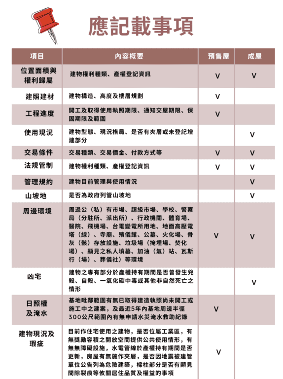 為保障消費者權益及提供買賣雙方充分的物件資訊,避免日後造成買賣糾紛,內政部2015年4月13日修正「不動產說明書應記載及不得記載事項」,增列應記載與不得記載事項,自2015年10月1日起實施。而自2020年5月1日起,成屋買賣定型化契約及不動產說明書,均應載明建物有無中繼幫浦機械室或水箱及行動電話基地台設施等資訊,使消費者充分掌握這些重要資訊,可參考下圖可一目了然: