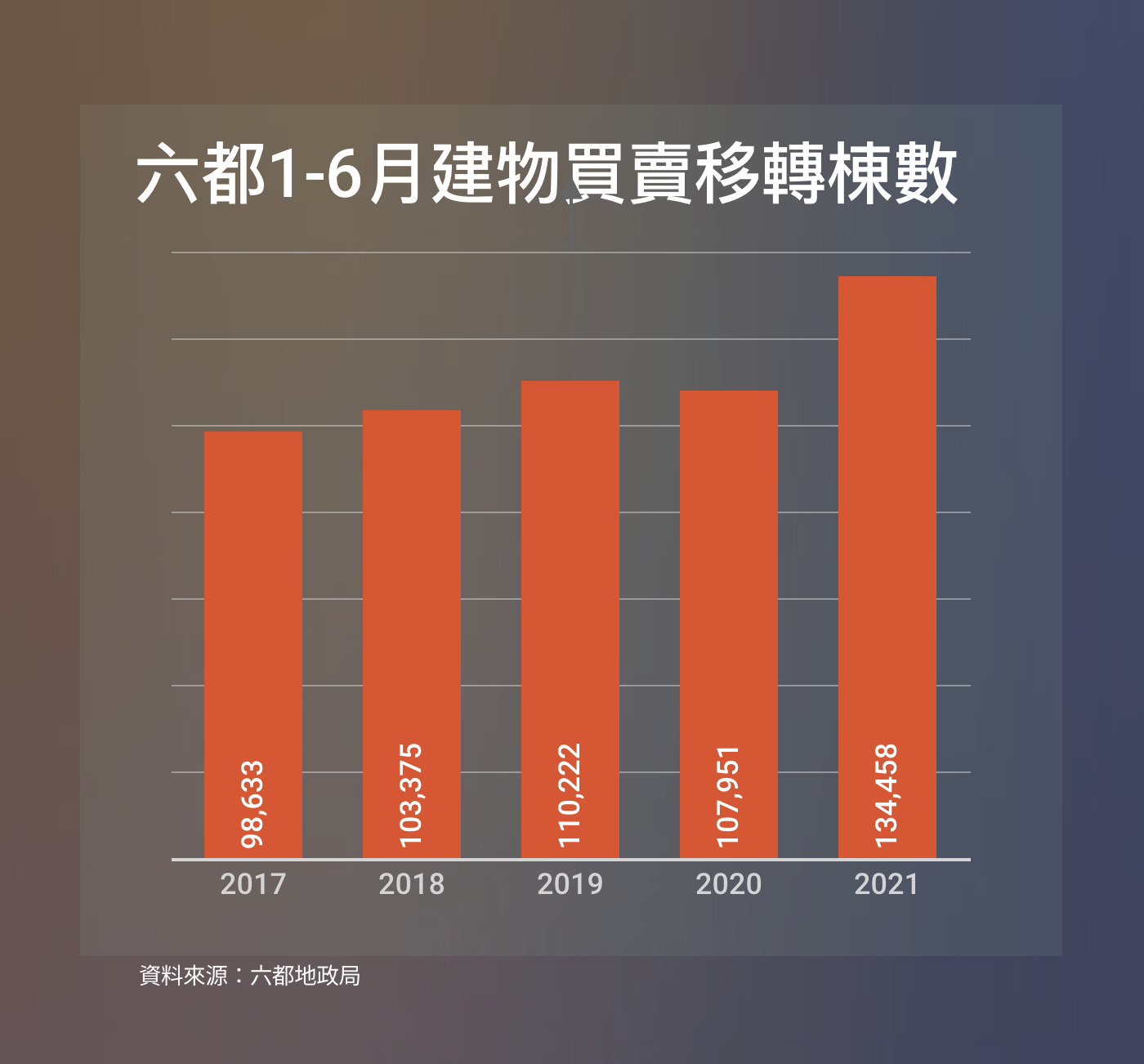 台灣並未獨立於這股房市熱潮之外。根據內政部住宅買賣移轉棟數統計,自2016年到2021年第一季,全台灣買賣總價漲幅達15.64%,內政部統計的六都建物買賣移轉棟數,在2021年1-6月累計為13.4458萬棟,較去年同期增加近25%,創下近8年來新高紀錄。