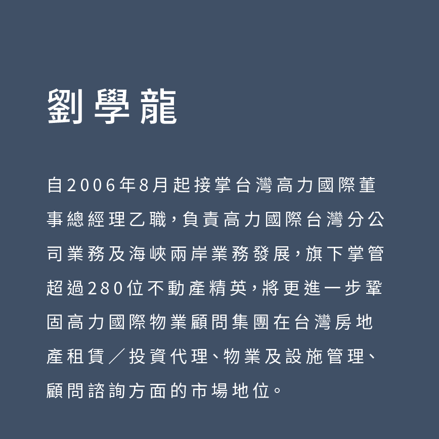 自2006年8月起接掌台灣高力國際董事總經理乙職,負責高力國際台灣分公司業務及海峽兩岸業務發展,旗下掌管超過280位不動產精英,將更進一步鞏固高力國際物業顧問集團在台灣房地產租賃/投資代理、物業及設施管理、顧問諮詢方面的市場地位。