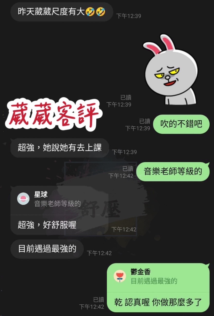 心得:一開始發現妹講話很直接,自己有稍微警惕一下怕講錯話,但聊開後發現原來妹妹是個美食家!按摩的時候都在聊美食,直到翻身,妹妹先自己去沖澡,然後開始用舌頭輕功,妹妹舌頭很軟所以很舒服。反正面後也是用舌頭舔遍,連豆皮都很認真舔,之後就是重點音樂,技術真的不錯,深度也夠深,但第一次我不敢音樂時亂動,躺著給妹服務就好。後來換我進攻也是很放得開,下面非常濕,很好玩,整體相當舒服,是沒有壓力的一台。
