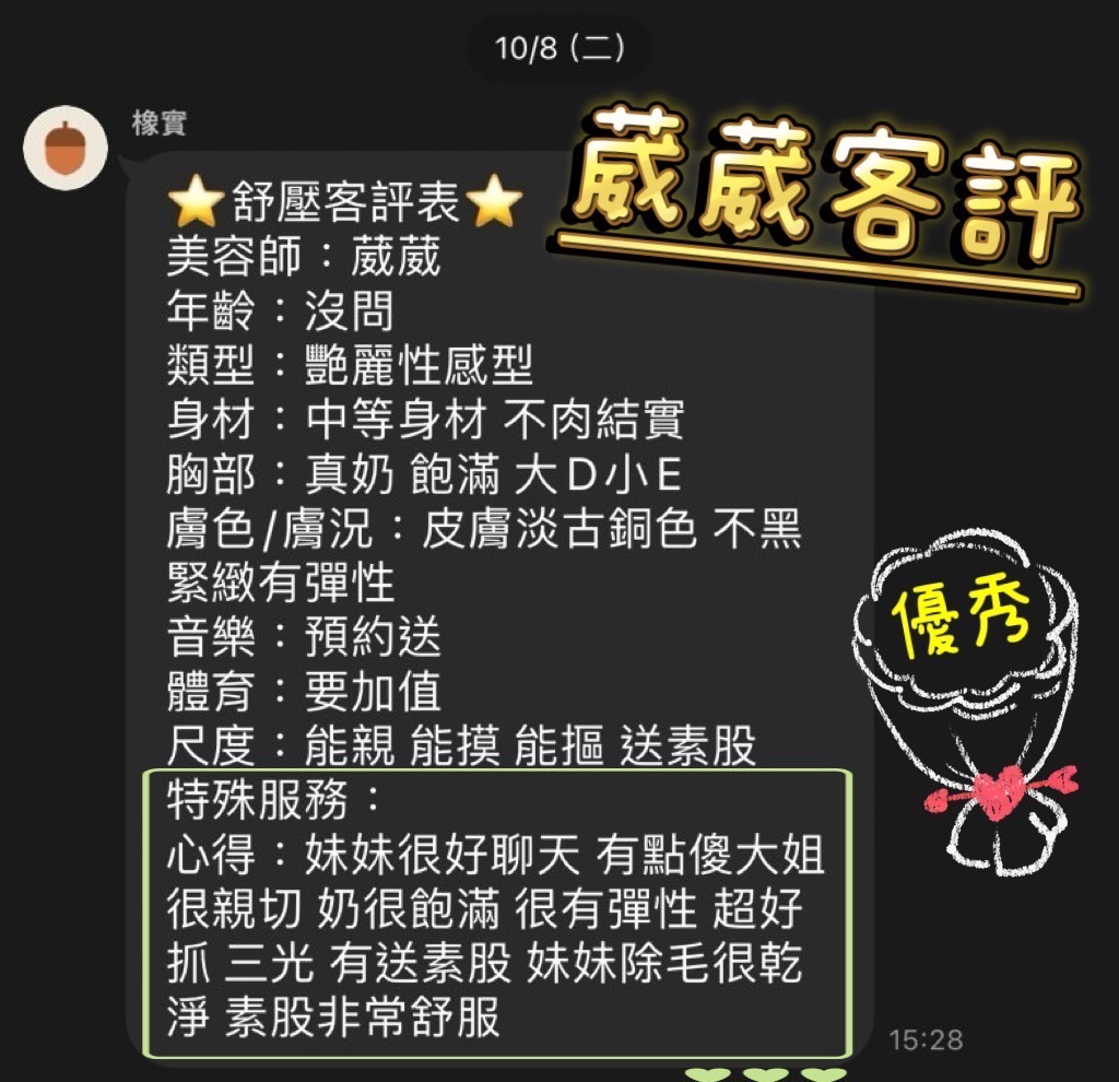 心得:正妹穿旗袍真的好看,胸型漂亮,好聊天,輕功跟按摩都讚,有消除疲勞。護理知識豐富,互動下來是讓人開心的。