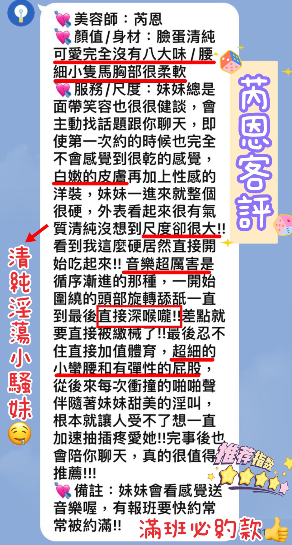 今天找芮恩,顏值中上而且蠻健談的,過程都沒有甚麼尷尬的場面,按摩跟輕功算是快速帶過直接翻身到重頭戲,身材蠻好的,微微的有一點腹肌,後面有加體育課,整體下來感覺蠻超值的。