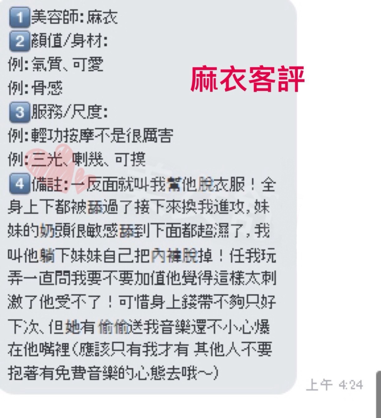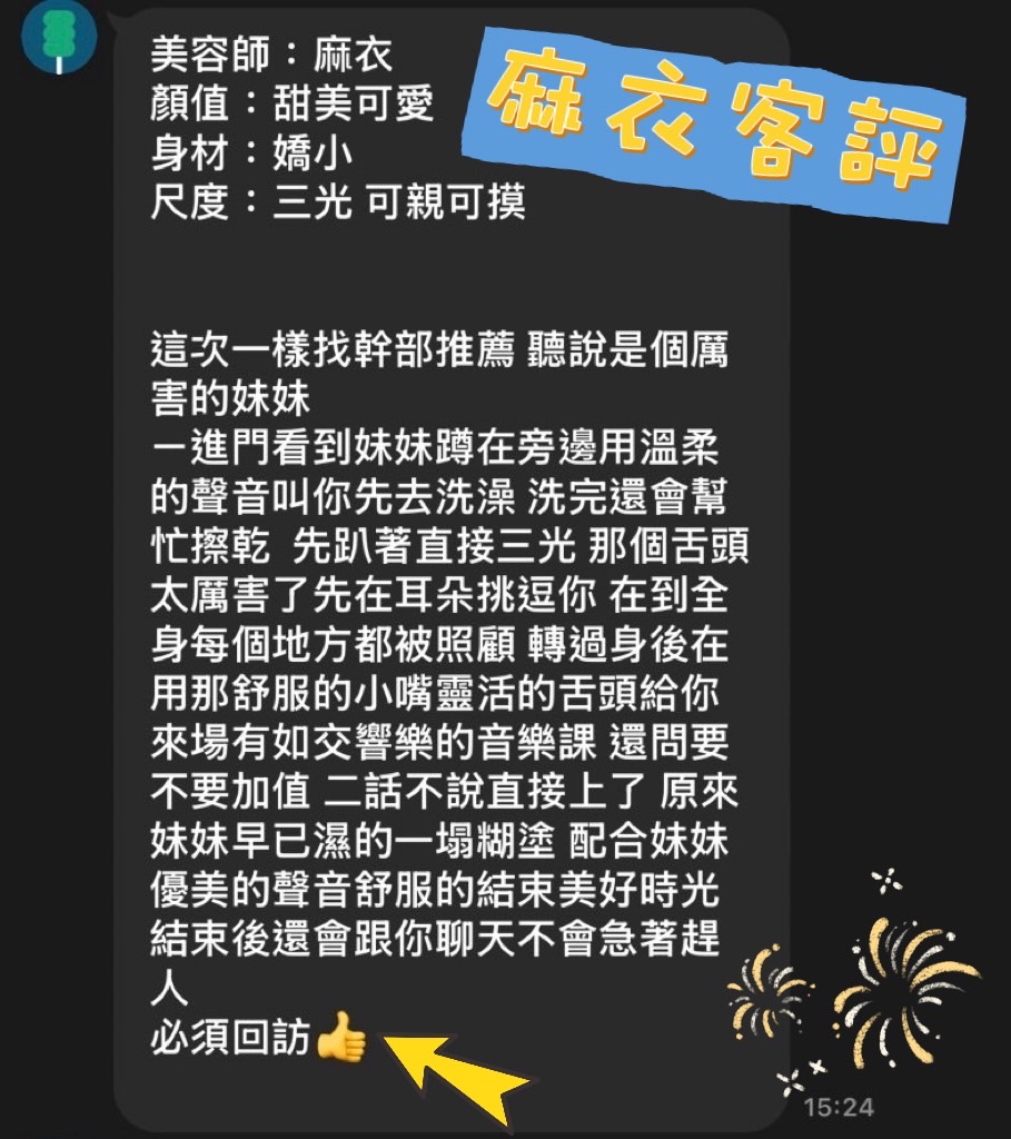 麻衣小隻馬,瘦大概只有B但好看。皮膚佳,無刺青無怪味。極度愛乾淨,有音樂LG可舔可吸,極度敏感。妹妹很主動,會莫名其妙很興奮,超讚