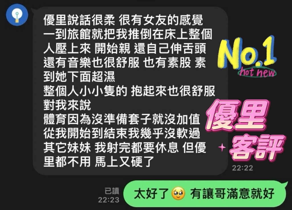 會讓人小鹿亂撞~~按摩功力不錯~真的會按那種!!接著三光~中間過程你來我往~~配合度很高~~有試著讓妹子爽到弓起身子~~妹妹又很會素股~讓我享受!!沒加值就體驗滿滿!!!