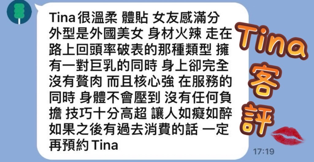 心得:除了肉了一點,但不到胖,其他都很好,漂亮健談,按摩也不錯,重點技巧好乳交很舒服,很想放棄找新的直接再找tina服務