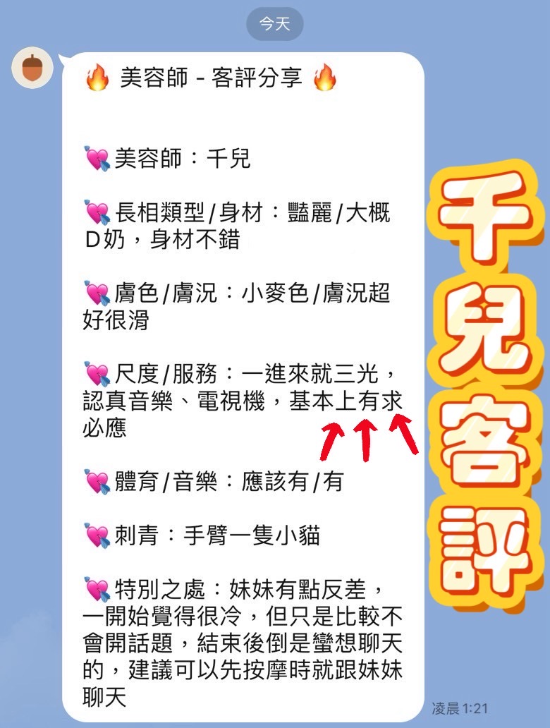 心得:妹子應該是個I人但還是能一直聊天 會跟你討論她的妝容O不OK 而且不抽菸還自備漱口水所以嘴巴很香 雖然沒加值但躺著被服務也是爽到飛天