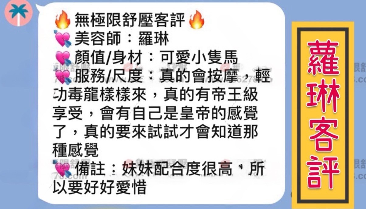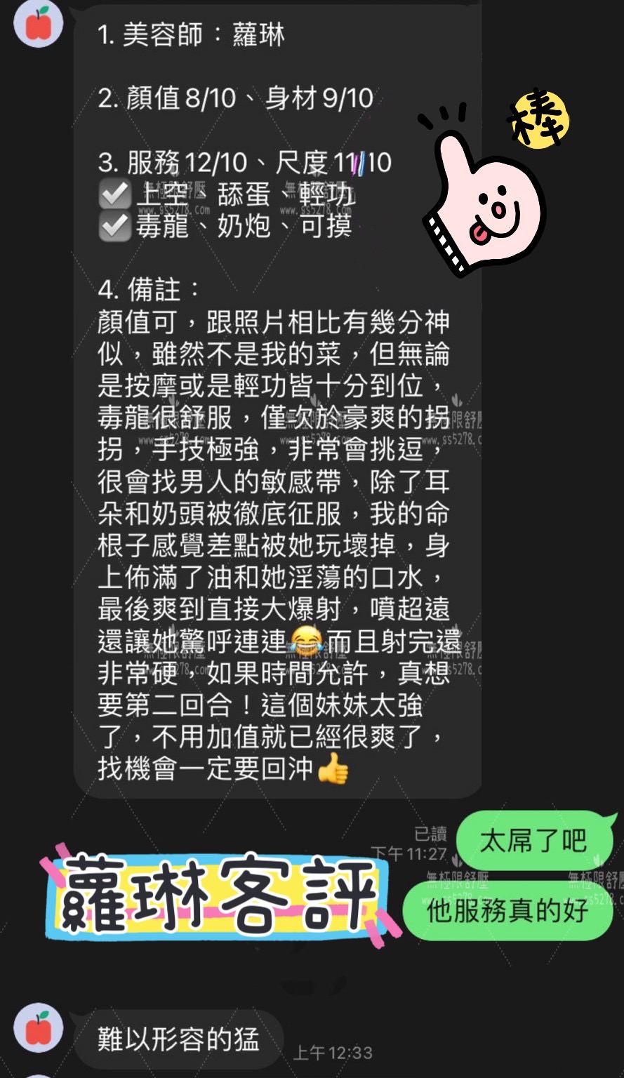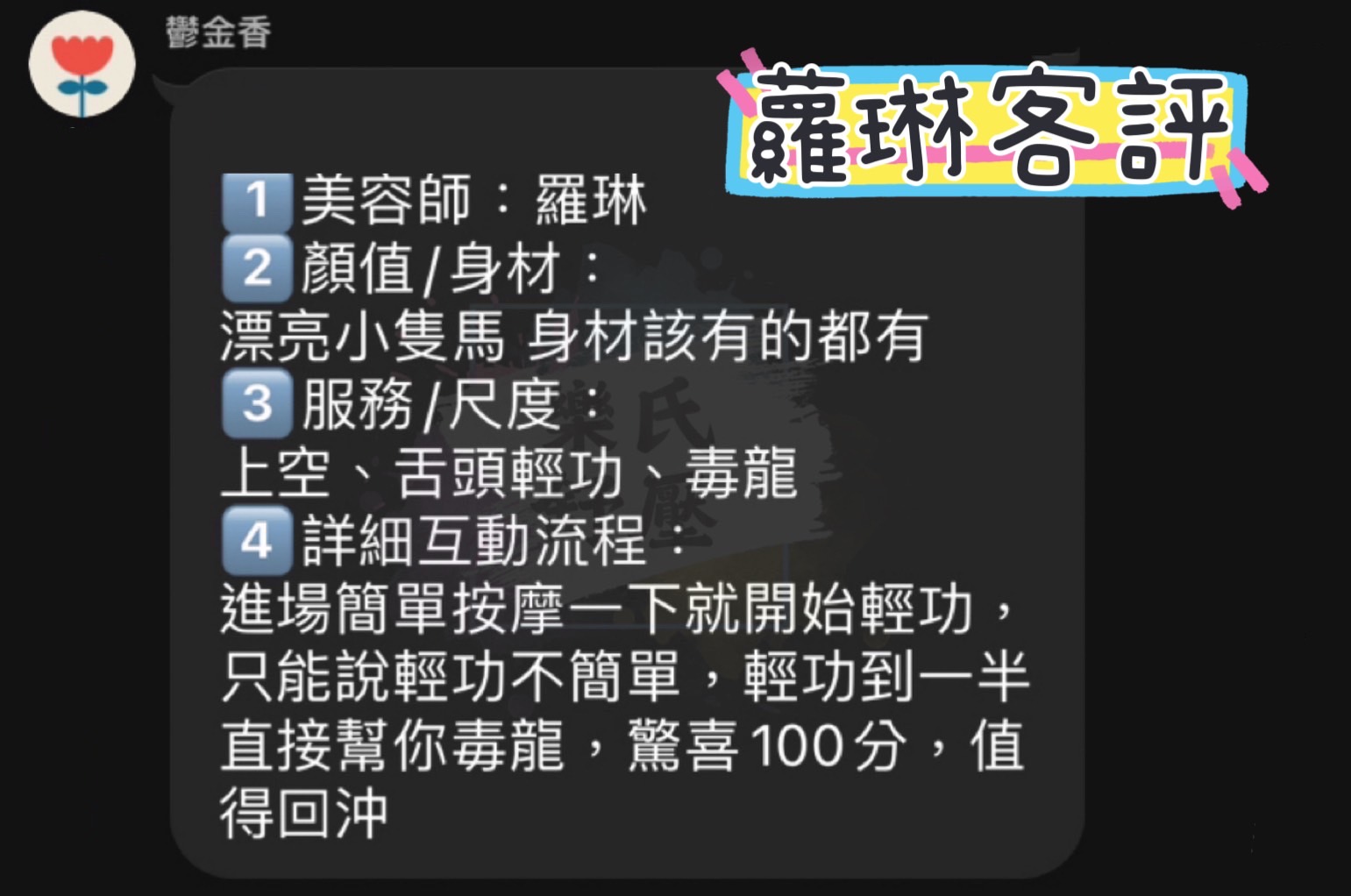 心得:按摩跳過直接輕功開始,舌頭在我身上沒有停過一直舔,舔一舔叫我屁股抬高然後毒龍,蘿琳聲音很細,本來要我轉身,我問可不可以久一點,就一直毒一直毒,最後轉身手法俐落,一下子就被KO了