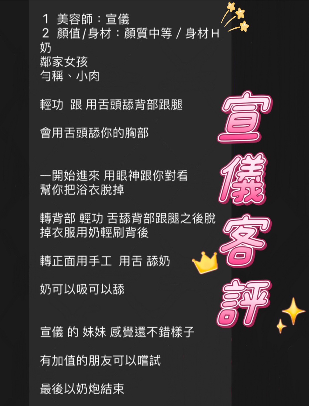 宣儀服務非常好,胸大、奶泡是專長,按摩也滿舒服的,