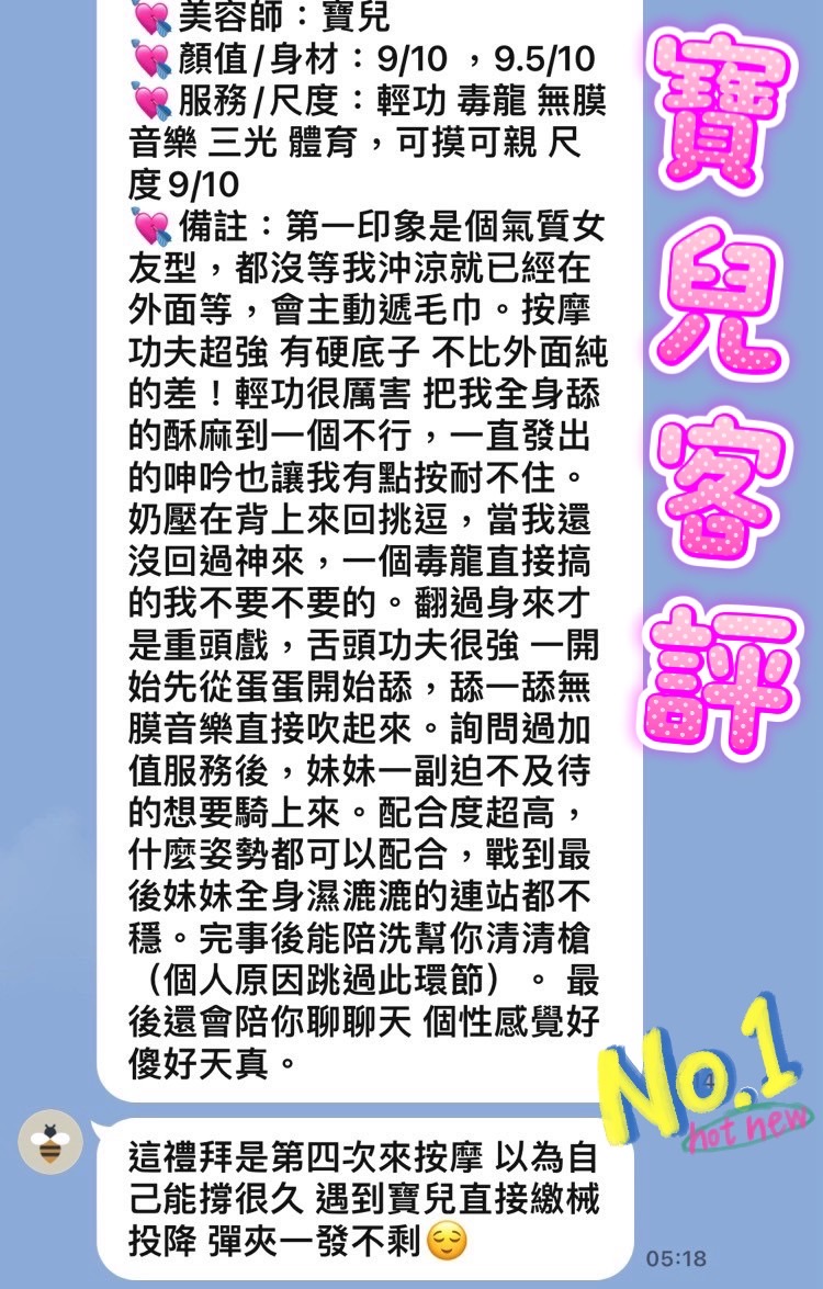 寶兒真的很騷 回沖第二次了 按摩也很強 送音樂 又陪洗 嘴巴又厲害 真的必須再回沖第三次