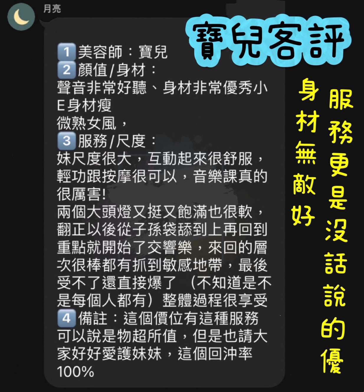 心得:幹部知道小弟想要什麼,排了個會按摩的小野貓個性的寶兒,整體很好聊天,推薦給白皙膚色、小隻馬、巨乳的朋友