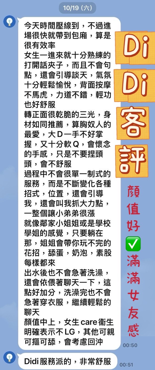 心得:DIDI說話跟動作都非常溫柔,只要不要過分的要求,她應該都會願意配合,真的很有女友的感覺,身心都得到滿足,這錢花的很值得,會再回訪。