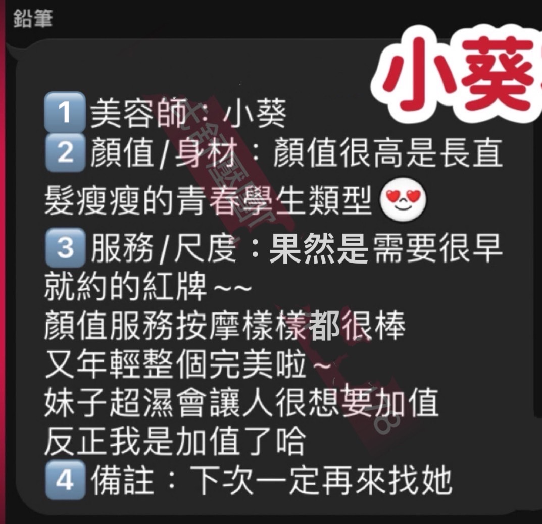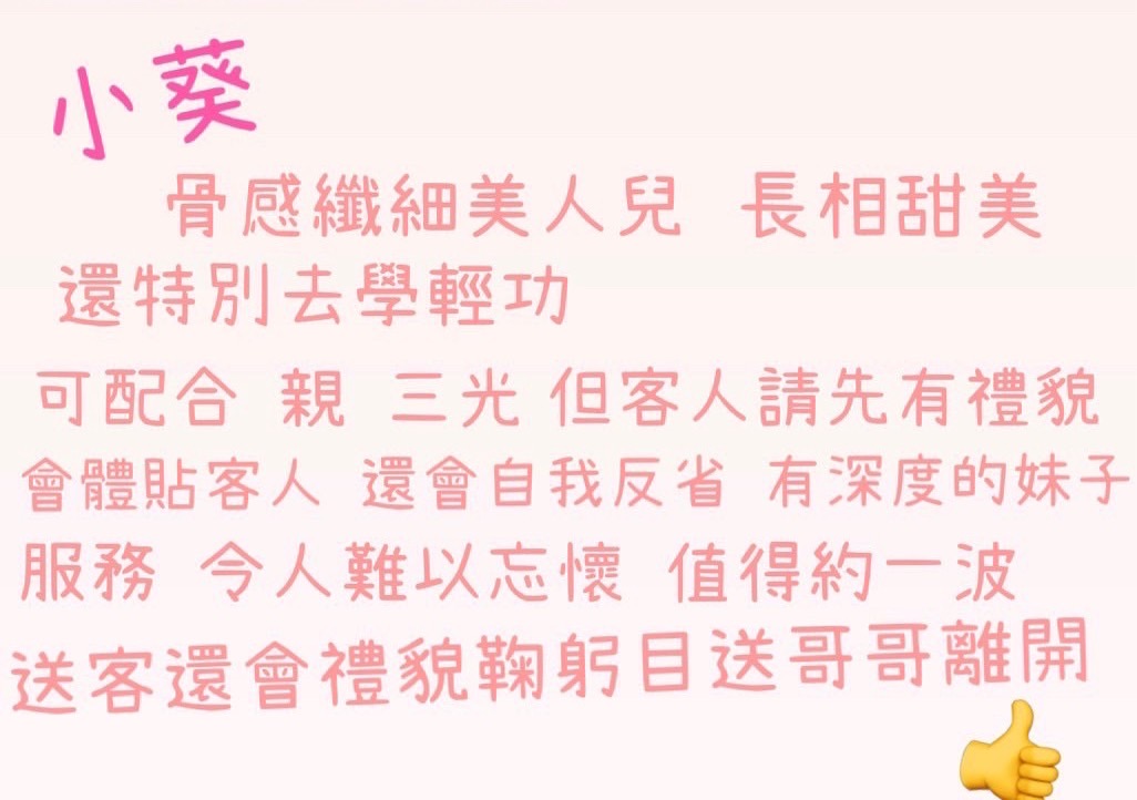小葵年輕、服務態度很好,而且很貼心,身材很苗條,身體好敏感,需要溫柔對待,下面很容易就一遍汪洋,女友感滿滿,而且時間是做到足完全沒偷懶,除了不能LG和奶不大以外,其他都沒有缺點,會回沖!