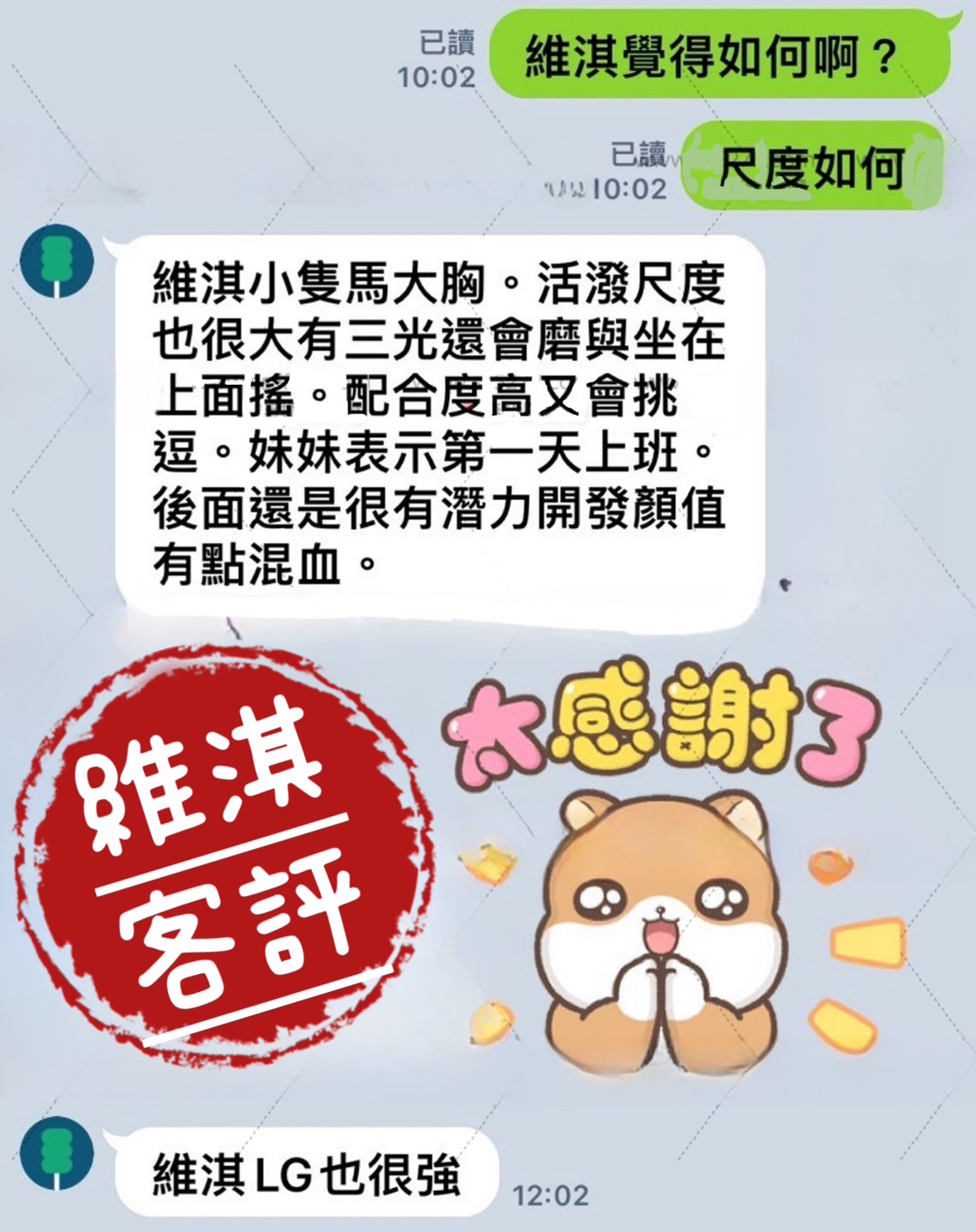 心得:主動三光~超大電視~可摳摳~說話嗲嗲的~~服務不會偷懶!!服務內容豐富!! 音樂奶泡LG舔蛋蛋~~哈哈哈 很多!重點她會主動進攻~會叫我幫她脫衣服 然後會素股!! 音樂課很會舔~~體育課也很好玩~
