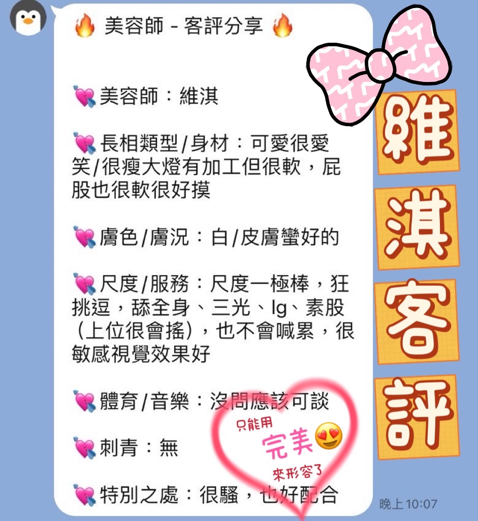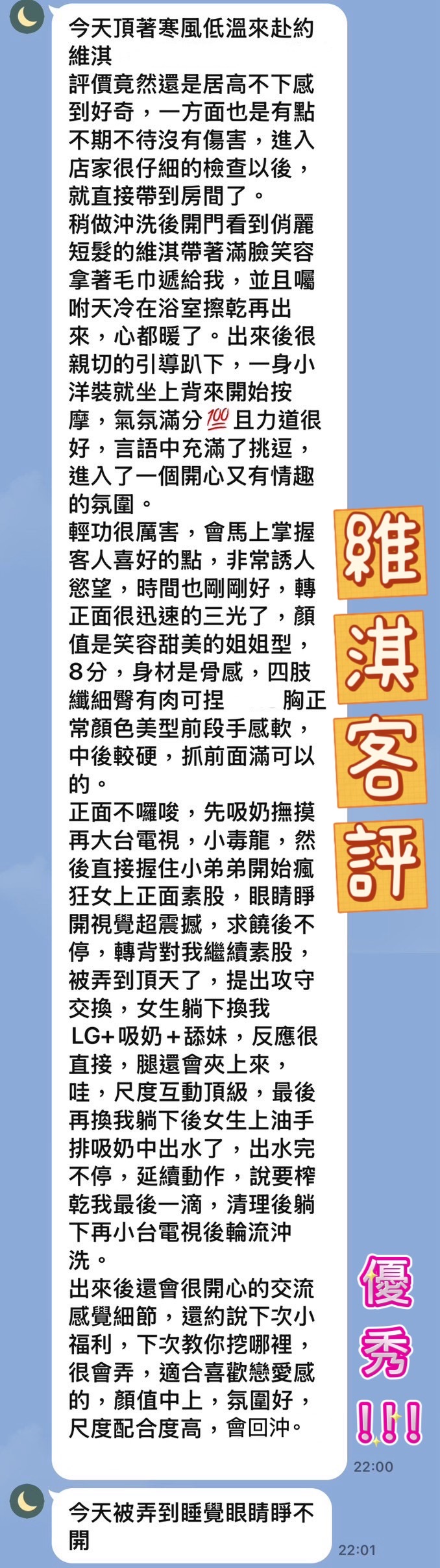 心得:一進門很熱情的打招呼,小聊一下,一開始先趴著就直接輕功,很酥麻,轉正後直接三光,必須說衣服有挑過,讓人想入非非,手工不錯,舌頭也很靈活,很會挑逗,不要過分要求都可以配合,本來想打奶泡最後被他素股到出來,真的是好妹妹,請好好愛護