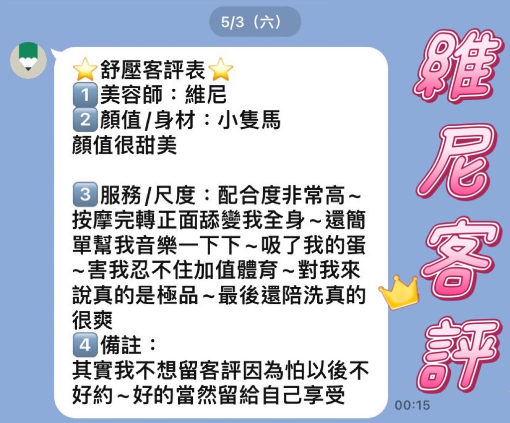 心得:背按開局,肩頸力道不錯,會側躺輕功,本人喜歡聽音樂,也會稍稍給感覺不錯的客人上點音樂,體育的部分沒有體驗到,被動三光,可小電視,uu偏敏感,有森林,以手排方式出水,滿分5分,我給4.2 ~~