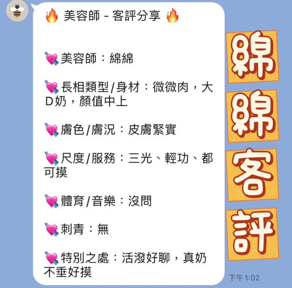 心得:好聊天,配合度蠻高,有點肉肉的,皮膚光滑好摸