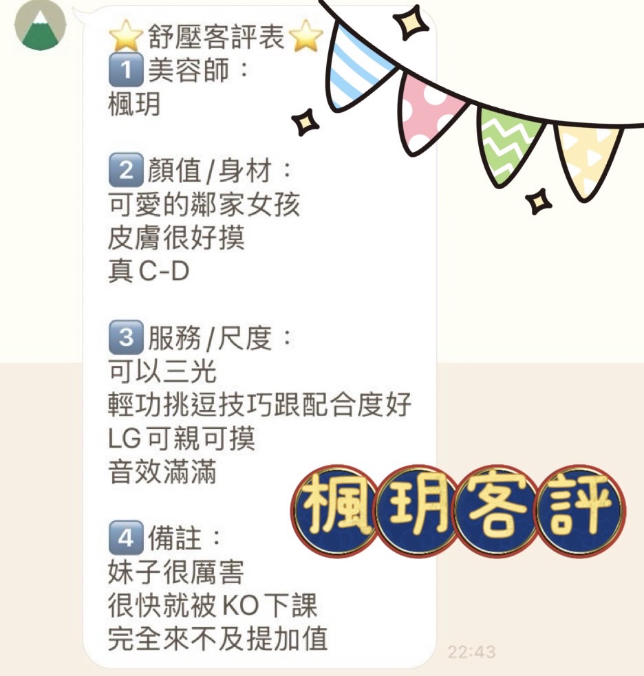 心得:放得很開,可以速戰速決,事後有陪洗。三光、LG、素股,可摸,可摳,可深入。體育送音樂(無膜)通通可以。要溫柔。
