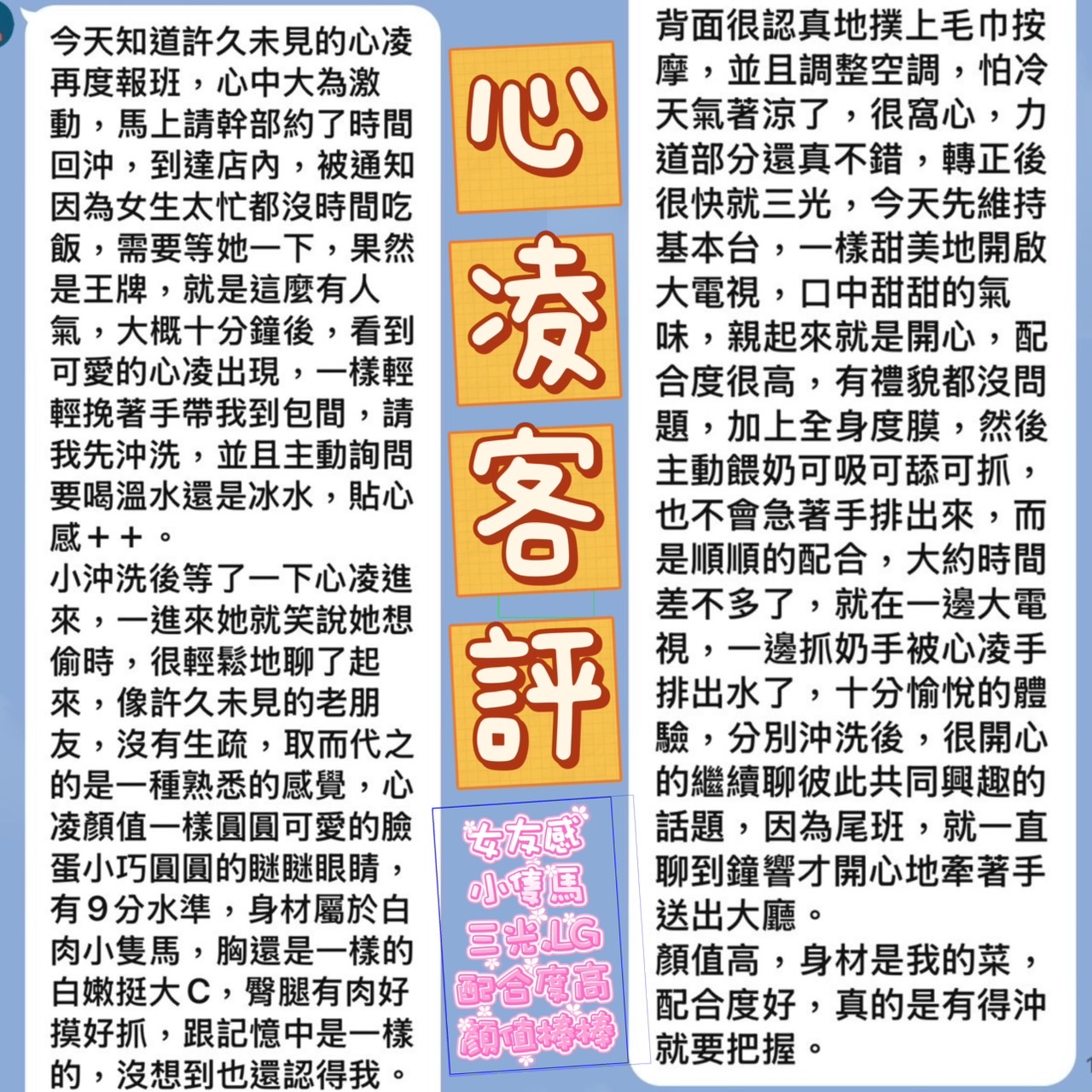 心得:雖然只有基本的消費服務,但美妹仍能夠讓我滿足,該有的按摩輕功都沒有少,全身上下也都願意讓撫摸及親吻,美妹說話聲音也很好聽輕柔,再加上會附上音效,一下子就讓人走上九霄,賽神仙。