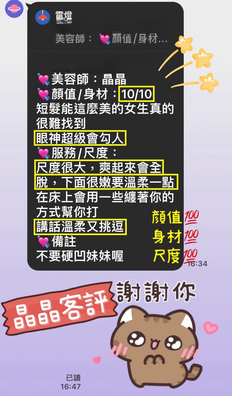 心得:手工超強基本台就很棒加值以後特異功能全開 啥服務都有超值的一台值得..回沖進包好好跟妹溝通有意想不到的服務!!!